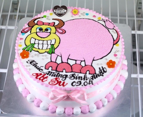 Bánh kem hình chú trâu với chiếc mũi to màu hồng hóm hỉnh tươi vui.