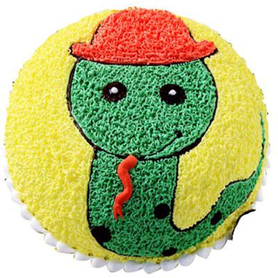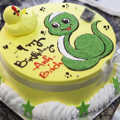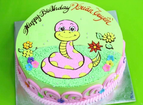 Bánh sinh nhật hình con rắn đẹp nhất thường vẽ hình con rắn, trang trí sắc sảo và thường có màu xanh lá.