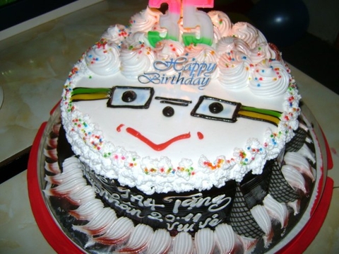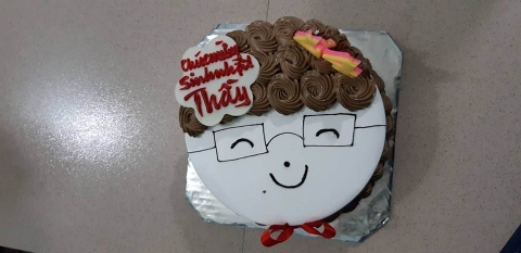Bánh sinh nhật tạo hình gương mặt thầy giáo trông rất ngộ nghĩnh và thú vị.