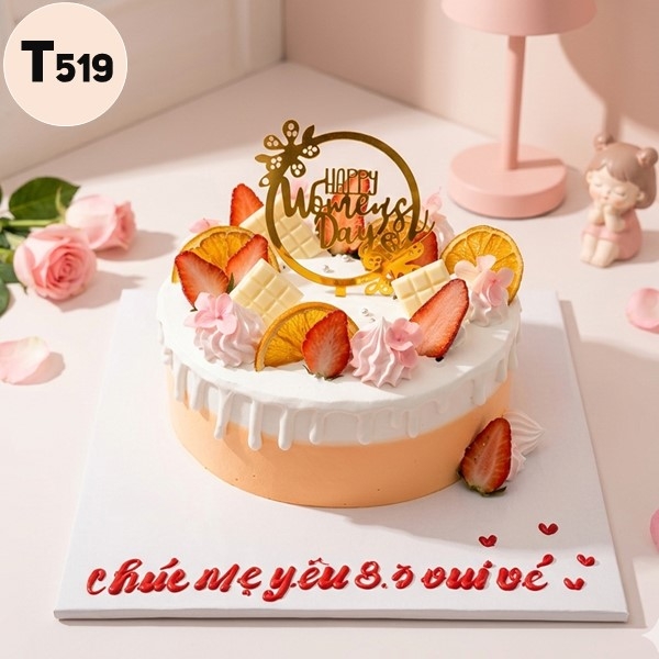 Bánh kem 8/3 T519 mẫu bánh hiện đại decor trái cây và socola trắng