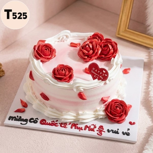 Bánh kem 8/3 T525 cốt trắng phủ hoa hồng đỏ kiêu sa rực rỡ