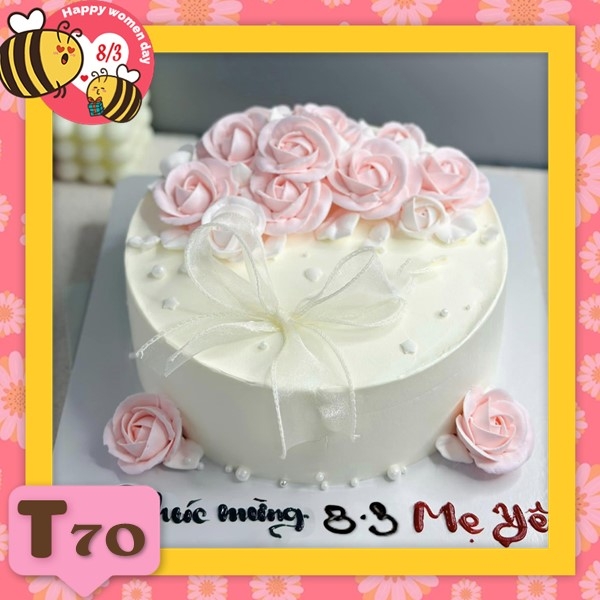 Bánh Kem T70 là một tác phẩm nghệ thuật tinh tế và thanh lịch, lý tưởng để dành tặng trong Ngày Quốc tế Phụ nữ 8/3. Bánh có lớp kem màu trắng ngà tinh khiết, tạo nền hoàn hảo cho những bông hoa hồng nhạt được tạo hình tỉ mỉ từ kem. Những bông hoa này xếp thành bó đẹp mắt ở phía trên bánh, mang đến vẻ đẹp lãng mạn và dịu dàng.