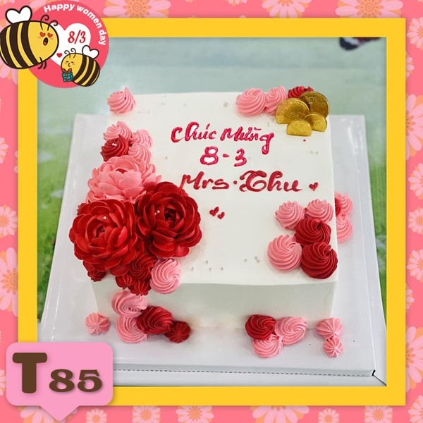 Bố cục bánh được thiết kế cân đối với sự kết hợp hoàn hảo giữa các yếu tố trang trí và màu sắc, mang đến cảm giác ngọt ngào và tràn đầy yêu thương. Bánh kem T85 không chỉ đẹp mắt mà còn mang ý nghĩa tôn vinh và tri ân những người phụ nữ quan trọng trong cuộc sống.