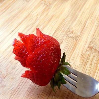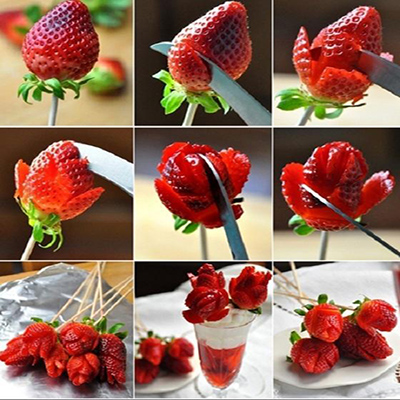 Nếu khéo tay hơn, bạn hãy thử sức với cách tỉa dâu tây thành những bông hoa xinh đẹp. Dĩ nhiên dụng cụ không thể thiếu là chiếc dao tỉa hoa quả hoặc dao có mũi nhọn rồi. Chỉ bằng vài đường cắt tỉa, bạn đã biến quả dâu quen thuộc thành đóa hồng quyến rũ. Chú ý tỉa những lát cánh hoa thật mỏng và vị trí xen kẽ lẫn nhau để tăng thêm độ tự nhiên và sống động bạn nhé!