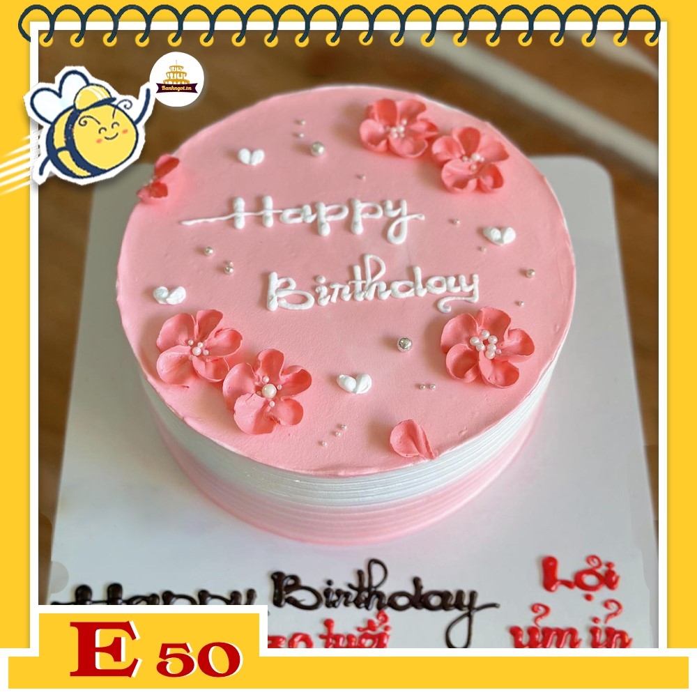 Bánh kem E50 của tiệm Bánh kem hương vị Việt là sự kết hợp hoàn hảo giữa màu sắc tươi sáng và phong cách trang trí tinh tế. Bánh có nền kem màu hồng pastel dịu dàng, mang lại cảm giác ngọt ngào và dễ thương. Trên bề mặt bánh, những bông hoa màu hồng đậm được tạo hình tỉ mỉ, tạo nên điểm nhấn nổi bật và sinh động.