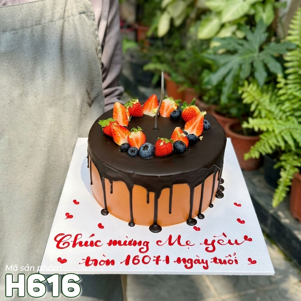 Bánh kem H616 phủ socola đen tan chảy mix dâu tây tươi