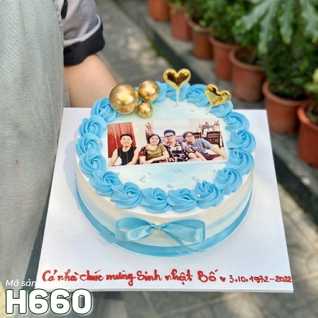 Bánh kem H660 in ảnh gia đình cùng viền hoa kem xanh bắt mắt