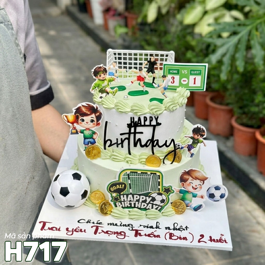 Bánh kem H717 sân bóng đá 2 tầng trang trí cầu thủ và cúp vàng sôi động