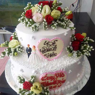 Mẫu bánh kem cưới lãng mạn trang trí hoa tươi tại Phan Rang