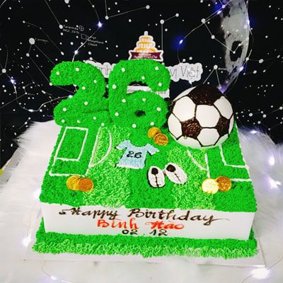 Bánh kem P76 vẽ hình sân cỏ bóng đá cùng những hình dán em bé trai vui vẻ