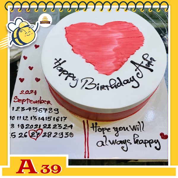 Bánh kem sinh nhật đơn giản A39 nền màu trắng trên mặt bánh vẽ trái tim đỏ và vẽ lịch tháng ở đế bánh