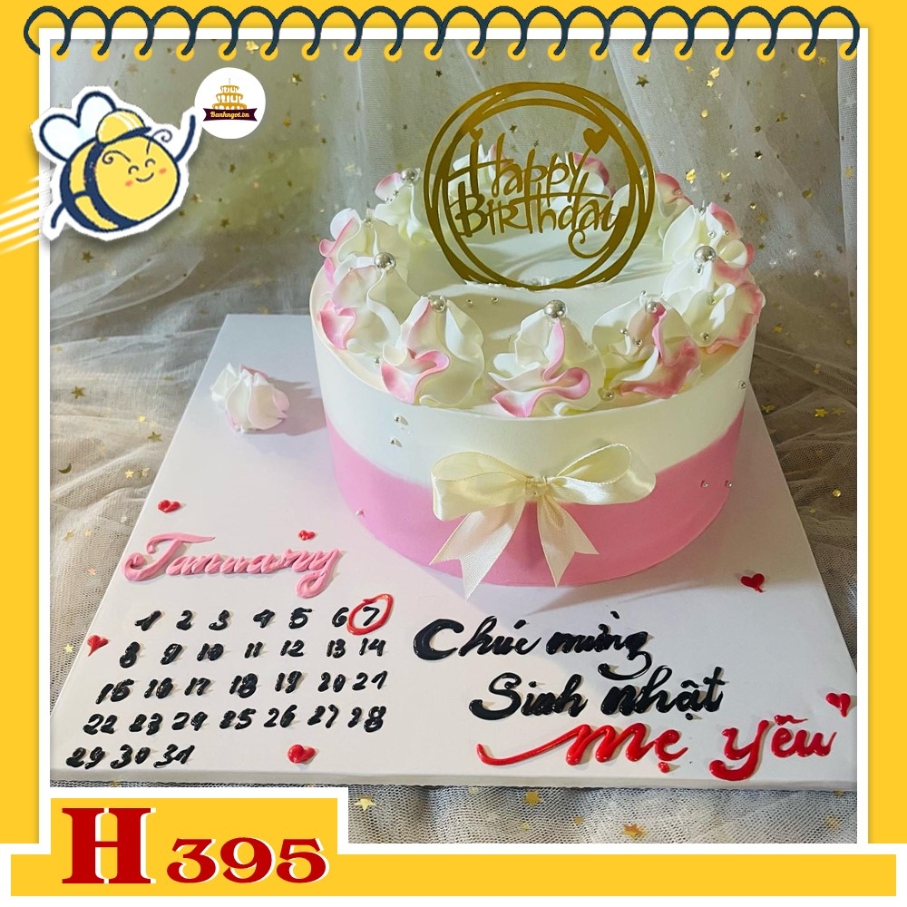 Bánh kem sinh nhật H395 lịch tháng sinh nhật mẹ yêu, trang trí hoa và nơ hồng