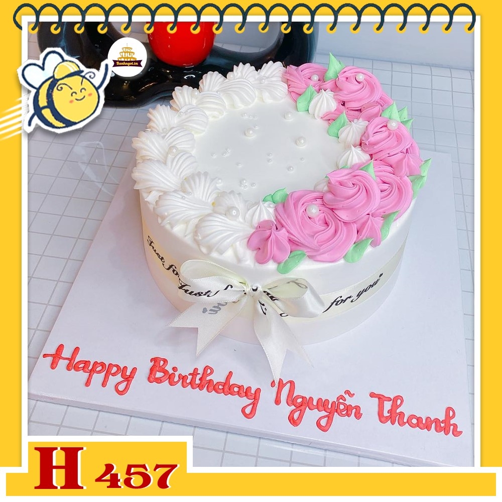 Bánh kem sinh nhật H457 hoa kem hồng trắng nửa vầng trăng ngọt ngào tinh tế