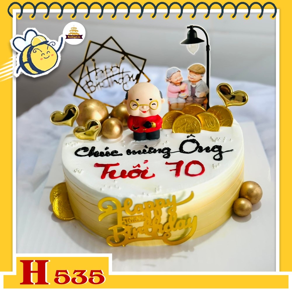Bánh kem sinh nhật H535 trang trí ông Thần Tài, bi vàng, tiền vàng