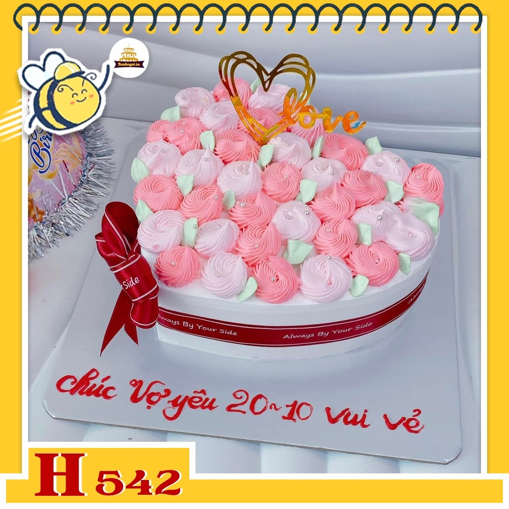 Bánh kem sinh nhật H542 trái tim tông hồng trắng, viền hoa hồng ngọt ngào