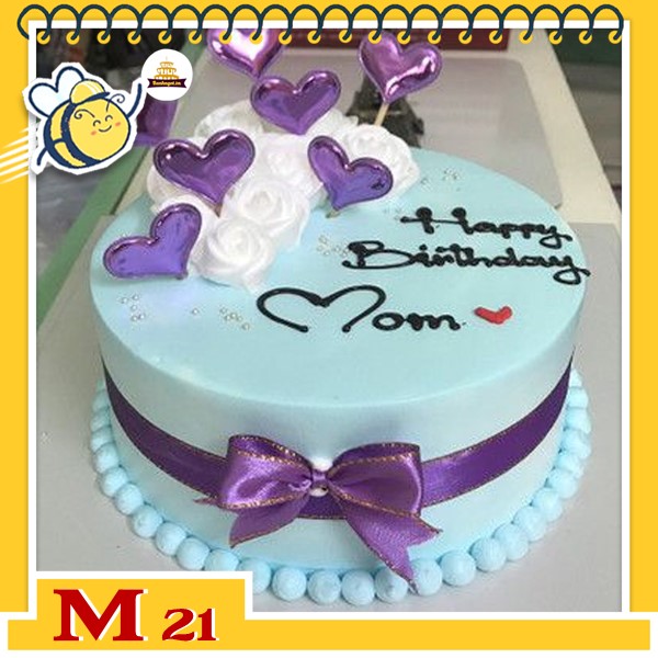 Bánh kem tặng mẹ M21 nền xanh nhạ trang trí hoa trắng và phụ kiện màu tím phù hợp mẹ trung niên