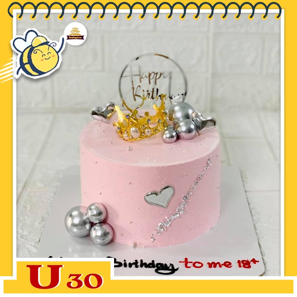 Chiếc bánh kem U30 mang đến một phong cách thanh lịch và sang trọng, đặc biệt phù hợp cho các dịp sinh nhật đặc biệt. Lớp kem màu hồng nhạt phủ đều trên bánh tạo nên sự mềm mại và dịu dàng. Điểm nhấn của bánh là chiếc vương miện vàng lấp lánh cùng các quả cầu bạc lấp lánh, tạo nên vẻ đẹp nổi bật và cuốn hút.