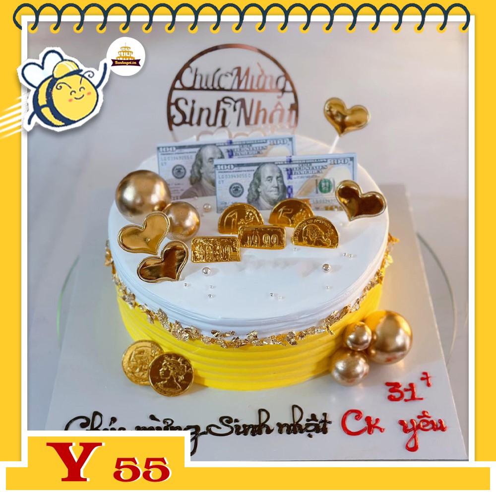 Bánh kem Y55 màu vàng trắng đang xen phụ kiện tiền vàng đô la sang trọng
