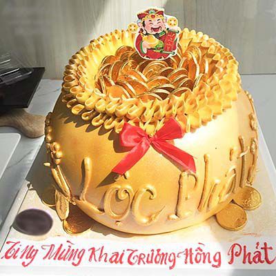 Mẫu bánh sinh nhật khai trương hồng phát hình hũ vàng ở Hòa Bình