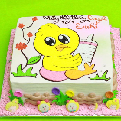 Trẻ em như búp trên cành, biết ăn biết ngủ biết học hành là vui, giống hệt như chú gà con chỉ biết chíp chíp chạy theo sau lưng mẹ gà. Những chú gà con màu vàng siêu siêu đáng yêu vẽ trên chiếc bánh kem sinh nhật giống như thay cho lời chúc các bé hãy luôn đáng yêu và năng động như các bé gà con.