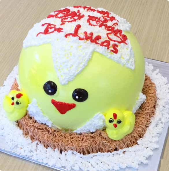 Mẫu bánh cuối cùng hướng tới phong cách dễ thương chính là bánh sinh nhật với cốt bánh và kem được tạo hình thành chú gà mới nở. Hãy ngắm nhìn cặp mắt, bộ lông, thân hình cũng như mỏ và mào của bé gà trên đây, bạn có đồng ý rằng chiếc bánh này thật sự ngọt ngào và đẹp mắt hay không? Đây chính là lựa chọn mà bạn không nên bỏ qua.