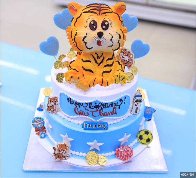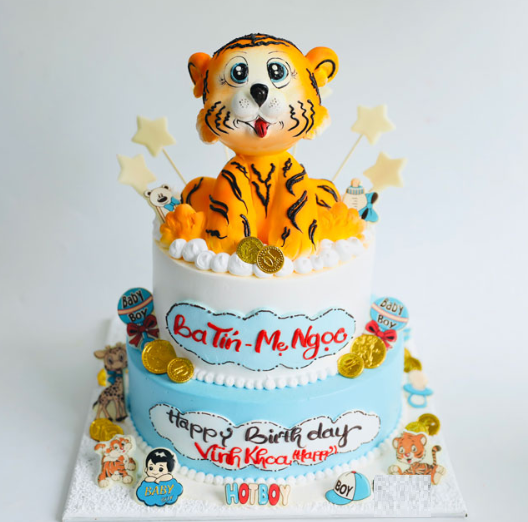 Bánh sinh nhật 2 tầng hình con hổ là một biến tấu mới của mẫu bánh kem thông thường. Bạn có thể chọn mẫu bánh cho này cho tiệc sinh nhật hoặc những cột mốc sinh nhật quan trọng như 10 tuổi, 18 tuổi,... Chiếc bánh 2 tầng sẽ thể hiện sự phát triển, chuyển biến mới đối với người tuổi dần.