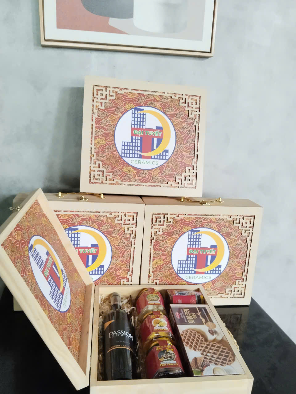 - Hộp gỗ thông cao cấp: Khắc hoa văn tinh tế, thích hợp cho các hộp quà Tết đẹp Long Khánh hoặc hộp quà Tết HCM.