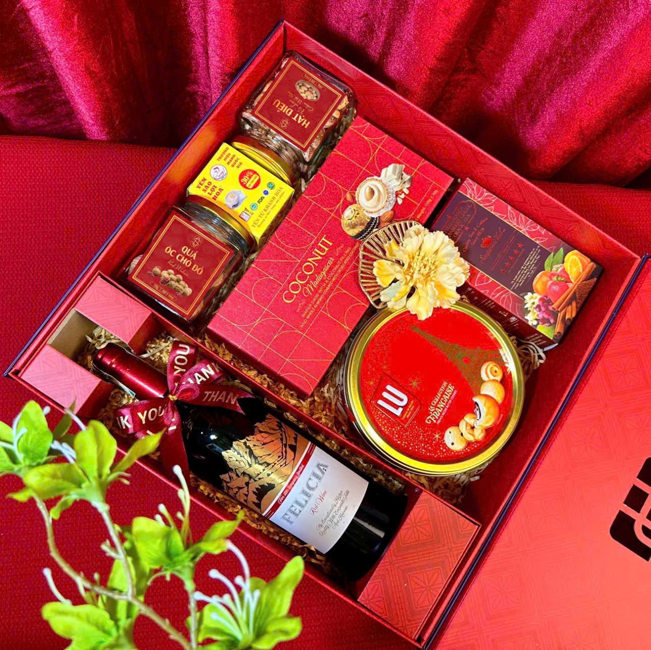• Giỏ quà Tết Huế được chọn lựa từ các thương hiệu uy tín, bao gồm rượu vang nhập khẩu, sâm Hàn Quốc, trà thảo mộc, hạt dinh dưỡng và bánh kẹo cao cấp. Hộp quà Tết Huế không chỉ đẹp mắt mà còn đảm bảo an toàn cho sức khỏe, đáp ứng mọi đối tượng người nhận.
