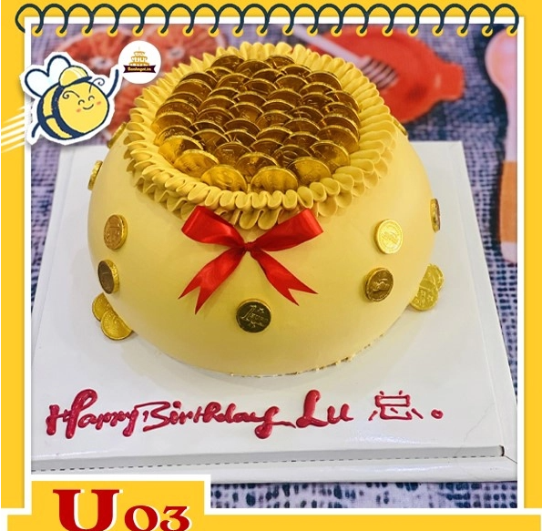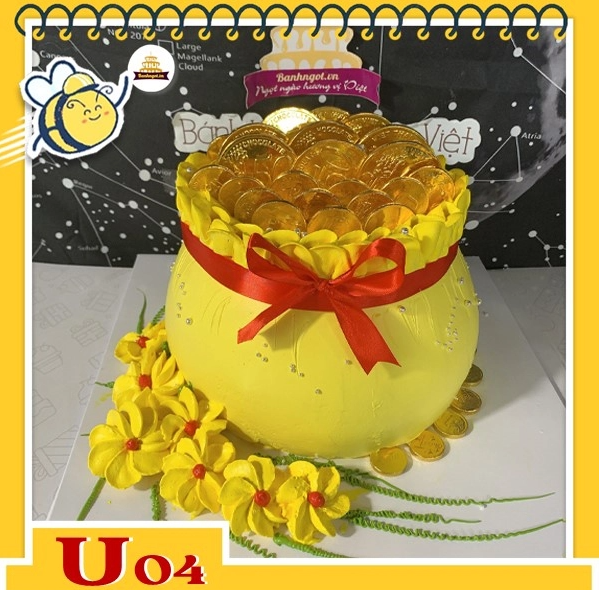 Bánh kem hũ vàng tiền đô U04 cao to bắt nhiều đó hoa vàng ở đế bánh