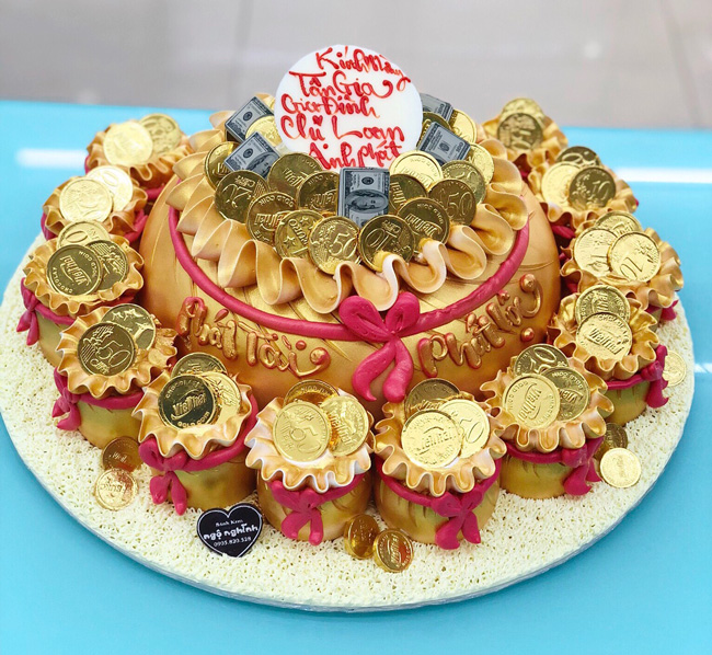 Những chiếc bánh kem hũ vàng được làm cực kỳ tỉ mỉ, thậm chí còn mạ vàng cho sáng bóng sang trọng. Đây là món quà cực ý nghĩa, người nhận bảo đảm sẽ thích mê và cười sảng khoái vì ai lại không thích được chúc giàu sang phú quý chứ.