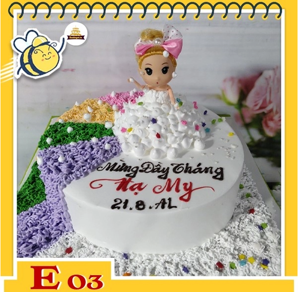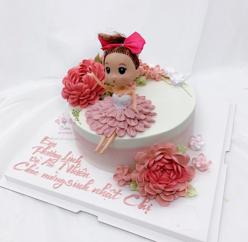 Bánh kem E23 sinh nhật bé gái búp bê váy cánh hoa hồng giá rẻ