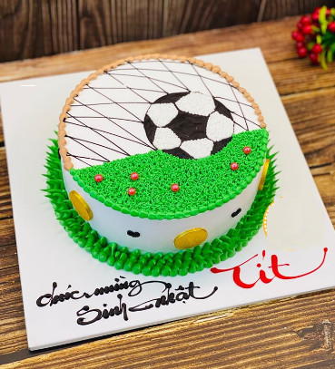 Bánh kem P76 vẽ hình sân cỏ bóng đá cùng những hình dán em bé trai vui vẻ
