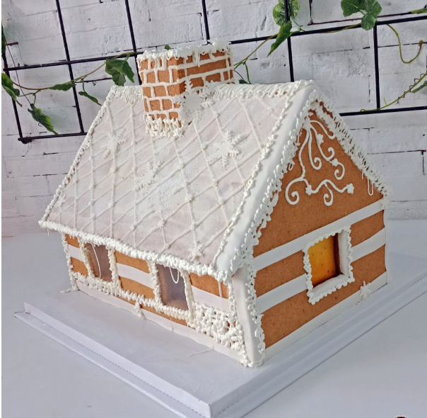 Bánh kem chocolate hình ngôi nhà, với những viên kẹo đường nhiều màu sắc và ngọt ngào, chiếc bánh kem được trang trí thêm những họa tiết đáng yêu như những đóa hoa tuyết li ti, những vòng hoa nguyệt quế màu đỏ ngọt ngào được đính trên chiếc cửa sổ, trông chiếc bánh thật lãng mạn và rất đáng yêu.