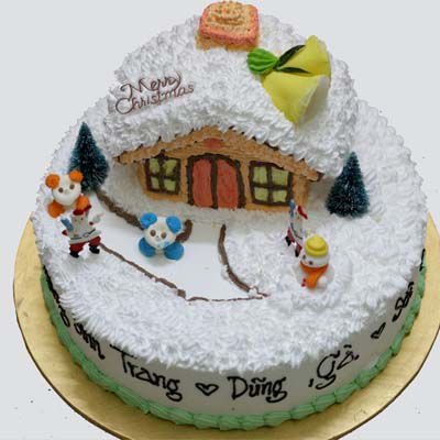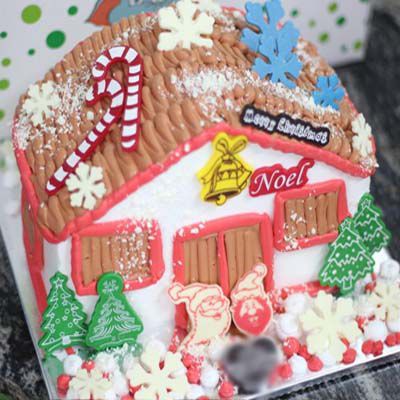 Chiếc bánh kem tạo hình ngôi nhà giáng sinh với những bông tuyết trắng xóa trên mái nhà, trước sân nhà được phủ trắng bởi những hạt tuyết rơi ngọt ngào, lãng mạn. Lại kèm thêm những chi tiết trang trí đáng yêu như cây thông noel hay những cây kẹo ngọt làm cho chiếc bánh kem thêm hấp dẫn và ngọt ngào.