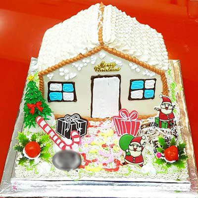 Bánh kem hình ngôi nhà màu trắng, với những viền kem tuyết trắng ngọt ngào, cùng với tạo hình ông già noel ngộ nghĩnh và dễ thương.