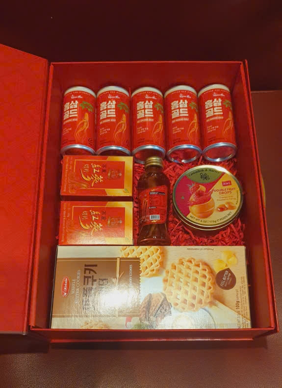 Giỏ quà Tết gồm Hồng sâm Hàn Quốc thái lát tẩm mật ong Sambok, Nước hồng sâm Queen Bin, Bánh Waffle Butter Cookies Nhật Bản, Kẹo trái cây Cavendish & Harvey Đức, cùng túi xách và vỏ hộp sang trọng, mang đến sự kết hợp hoàn hảo giữa sức khỏe, hương vị và đẳng cấp.