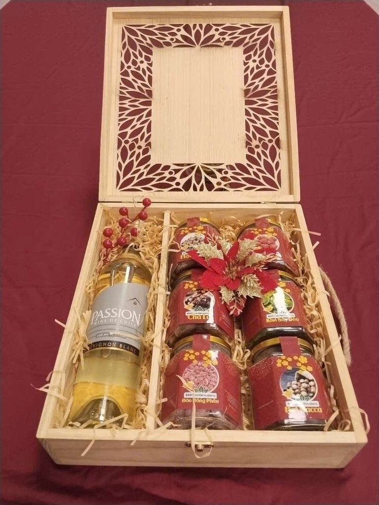 • Hộp gỗ thông với hoa văn tinh tế, mang vẻ đẹp truyền thống kết hợp hiện đại, nâng tầm giá trị của set quà Tết.