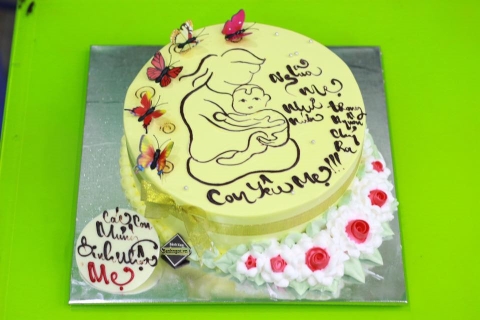 Chiếc bánh kem hình tròn màu vàng vẽ hình mẹ đang ôm ấp con thơ vào lòng. Ấm áp ngọt ngào và có ý nghĩa rất thiêng liêng, xúc động.