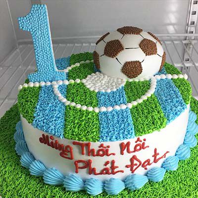 Bánh kem P76 vẽ hình sân cỏ bóng đá cùng những hình dán em bé trai vui vẻ