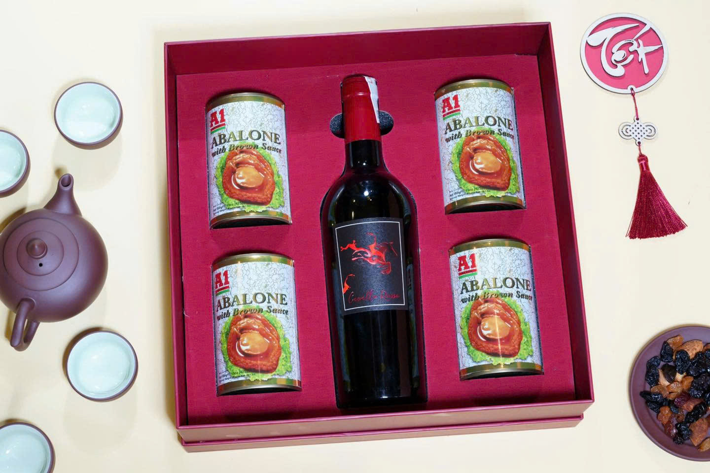 - Hai bên rượu: Đặt sâm lon ở một bên và hộp bánh ở bên đối diện để tạo sự cân bằng.