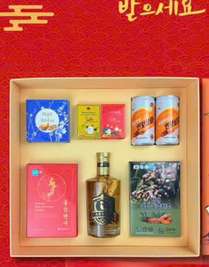 - Bốn góc hộp: Đặt các sản phẩm sâm Hàn như cao sâm, kẹo sâm, hoặc sâm nhung Hàn Quốc tại bốn góc để tạo ra hình ảnh đầy đặn, sang trọng, tạo cảm giác hộp quà không chỉ đẹp mà còn dồi dào, sung túc.
