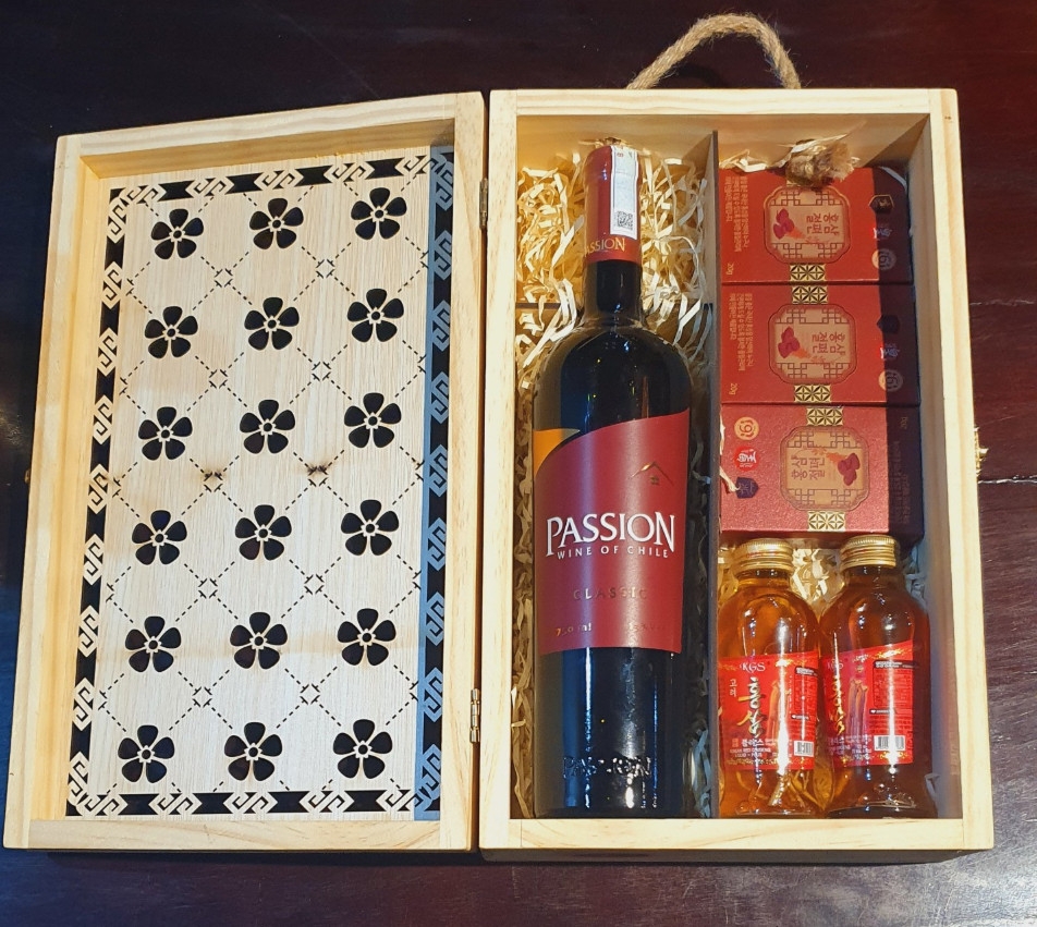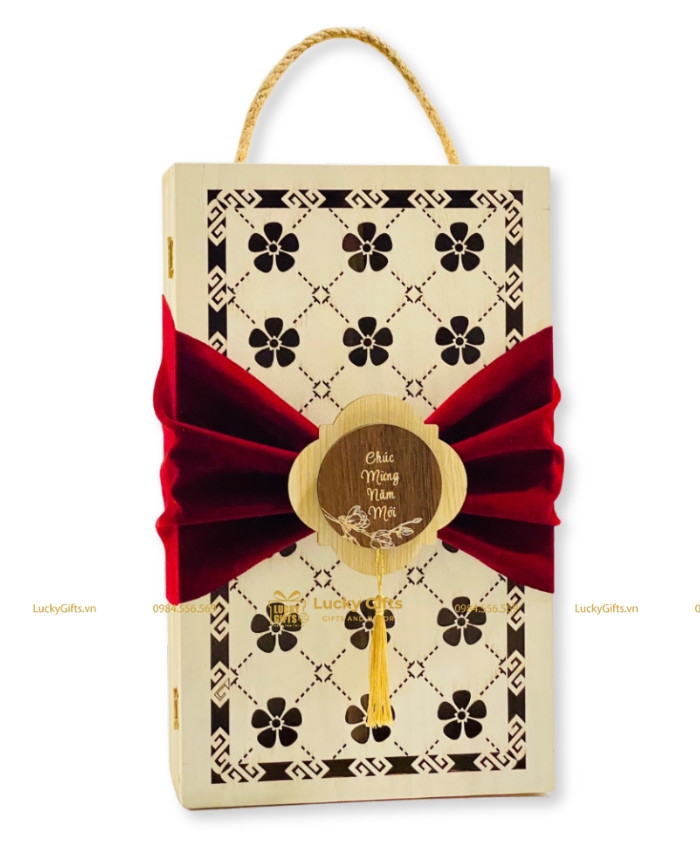 Hộp quà được thiết kế từ gỗ thông tự nhiên, trang trí họa tiết hoa văn tinh xảo, mang đậm nét sang trọng và cao cấp.